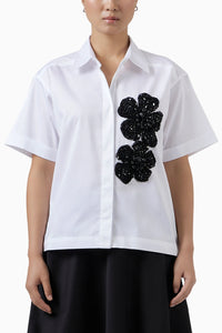 An elevated reinterpretation of the classic crop shirt, this piece is defined by its exquisite hand craftsmanship. Cut in pristine white with a sharp classic collar and half sleeves, it is adorned with two floral appliqués crafted on fine tulle. Each bloom is intricately embroidered with a mix of sequins and beads in varying sizes and finishes, creating a rich interplay of texture and light. Every detail is hand-applied, celebrating artisanal artistry and lending the shirt a couture sensibility.