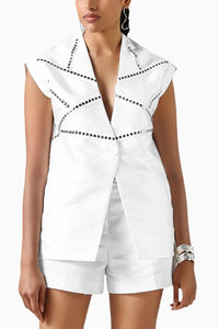 A taffeta silk white sleeveless jacket with silver stud detailing, available with pants or shorts for versatile styling.