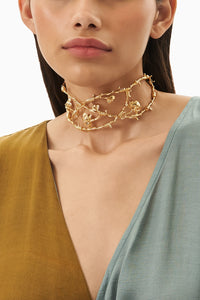 This neckpiece features entwined wires which resemble branches with delicate small blossoms which add a sense of whimsy. The neckpiece is perfect for those who love timeless elegance with a twist of artistic fashion.