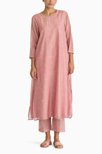 Introducing the Handwoven Chanderi Flower Print Kurta Set in a classic old rose color. This elegant set features a beautifully detailed flower print, showcasing the intricate craftsmanship of handwoven chanderi fabric. It is paired with cotton trousers that include subtle print detailing, adding a touch of refinement. This ensemble effortlessly combines traditional artistry with modern style, perfect for any occasion.