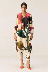 Featuring an off-white vibrant floral printed kurta with full sleeves and a V neckline, crafted in soft cotton mul, this set is paired with fully elasticated floral printed mul pencil pants. Fully lined and designed with side seam pockets for added comfort and functionality.