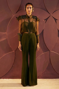 Noir co-ord set with embroidered organza shirt with pintucks collar and tucks organza cuffs with details of thread petals above the cuffs and on the shoulder line and have flounce on the shoulder highlighted with cutdana paired with bustier or inner and flared pants