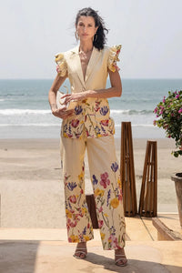 This floral pant set features a chic sleeveless blazer with double frill sleeves, adding a playful yet sophisticated touch. The vibrant floral print and tailored fit make it a stylish choice for both casual and semi-formal occasions.