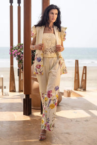 This floral pant set features a delicate lace inner paired with a sleeveless blazer, accented by double frill sleeves for a feminine and stylish touch. The vibrant floral print adds a pop of color, making it a perfect choice for a chic, elegant look.