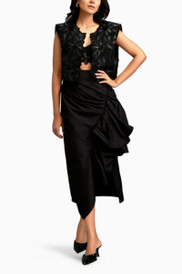 Make a bold fashion statement with this chic ensemble featuring a sleeveless black cropped top adorned with delicate floral applique, adding a touch of elegance and texture. The top effortlessly blends modern minimalism with feminine charm. Paired with an asymmetric ruched skirt, this outfit exudes contemporary style with its flattering silhouette and sophisticated ruching detail. Perfect for a night out or a stylish event, this ensemble is the perfect combination of edgy and refined.