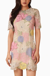 Introducing Shriya Som's multi-floral bodycon dress from the Chrysalis Collection, crafted in a tulle base and adorned with signature multicolor floral motifs and intricate embroidery. Accentuated with stunning crystal embellishments for a dazzling finish.