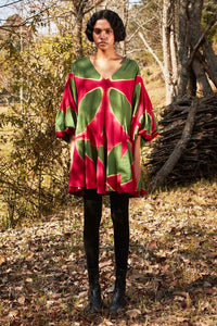 This one-of-a-kind vibrant cotton Shibori dress, dyed in striking pink and green, offers a bold, distinctive look. Featuring puffy elasticated sleeves and a flattering V-neckline, it combines artistic flair with feminine elegance. Fully lined for comfort and structure, this dress is a unique statement piece perfect for making an impression.