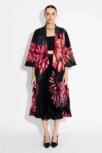 Featuring Floral Coverup and Sunrise Skirt Set by Shasha Gaba, this black co-ord combines a lightweight banana crepe coverup with a flowing poly satin pleated skirt. Perfect for pret wear, it blends Indo Western elegance with effortless style for versatile occasions.