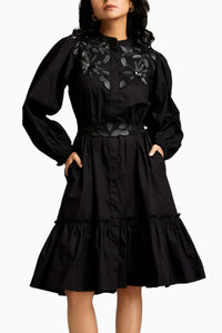 Elevate your style with this sophisticated dress, showcasing intricate floral embroidery that adds a rich, artistic touch to the design. The long, structured sleeves create a refined and elegant silhouette, perfectly complementing the dress's classic yet modern appeal. A flattering belt cinches the waist, accentuating your figure and adding definition to the ensemble. Ideal for formal occasions or evening events, this dress combines timeless elegance with bold, intricate details for a standout look.