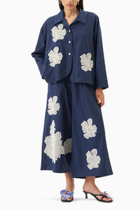 Featuring a cotton co-ord set with applique lace embroidery and wide-legged pants, this ensemble exudes effortless elegance with its intricate detailing and relaxed silhouette.
