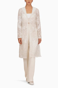 This classy long jacket features handcrafted fringes and intricate 3D floral embroidery, adding a touch of sophistication and texture. It is paired with a timeless plain bandeau and elegant straight pants, creating a refined and stylish ensemble.