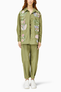 Featuring a green shirt in cotton base with beautiful floral hand embroidery, which is perfect for winter and summer wardrobe. Wear it over your denims or pair it with our khaki pleated pants, which will upgrades your everyday look. Comfortable and trendy travel piece for sunny days.