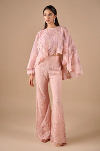 Dreamy and elegant, this pink cape is crafted in soft tulle and lace, detailed with intricate hand embroidery. Designed in a fluid, comfort-fit silhouette with an airy drape, it adds ethereal charm and refined femininity to festive and evening ensembles.