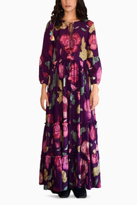 Our Floral Mauve dress in Chanderi silk is refreshed in foliage print featuring a split V-neck, statement sleeves, and multiple tiers. It also has exquisite details such as a beautiful handcrafted tie-up with tassels in the front. This easy, breezy, flowy dress is perfect to wear while lounging around at the resort.