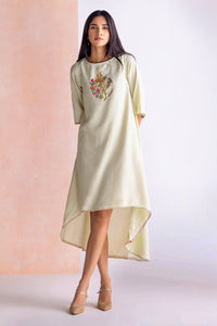 Floral Moon Dress is crafted in a breathable linen blend, designed with a flowing high–low hemline and graceful 3/4 sleeves. Adorned with delicate anchor thread embroidery and gold foiling, it offers a comfort fit with effortless elegance for daytime, festive evenings, and intimate celebrations.