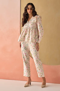 Elevate your style with our Floral Print Co-ord Set, featuring delicate lace detailing on the sleeves and hem. This chic ensemble boasts a flattering V-neck with a half front opening, perfectly paired with slim fit pants for a polished look. Ideal for both casual outings and special occasions, it effortlessly blends elegance with modern flair.