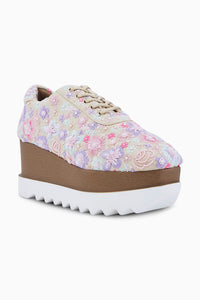 Our Floral Polka wedge sneakers are dotted with beautiful florals all over. Each floral design is crafted in pastel-coloured resham threads and made using zardozi embroidery. To add to the delicacy of these blooms, we have embellished them with cutdana work and sequins.The pastel florals blossom joyfully on the shoe’s beige fabric to make a big, soft, sweet splash. Step into this polka garden on a special day to be greeted with mesmerised smiles. They will perfectly match your next pastel ensemble waiting to debut at Wedding Season 2024. The artisans of Anaar take 52 hours to carefully construct this pair.
