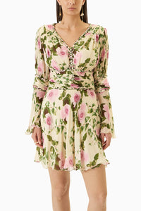 Chiffon green floral print short dress, fit and flare sleeves, conceal zipper at sideseam for fastening, show fabric button at centre front, fabric drape at waist, knotted fabric detailing at neck and sleeves edges.
