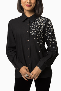 This shirt is waisted yet has a regular fit. It is adorned with floral embellishment across the shoulder and sleeve creating a statement. Embrace the more-is-more approach by styling it with sparkling jewelry.