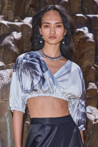 Grey scale floral crop top that can be worn two ways. Overlapping surplice style front with kaftan-inspired sleeves. Placement floral print on the front, sleeves, and back. Elasticated at the hem and cuffs. Round neck with a zipper at the back. Can be styled/worn two ways – as a regular fit with the overlapping front, or worn upside down for an elasticized off-shoulder cropped look and twist-front/asymmetric cut detail.