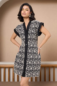 A stylish mini dress featuring a black and white floral tapestry print with bold black trim, short sleeves, and a button-down front, perfect for a chic and modern look.