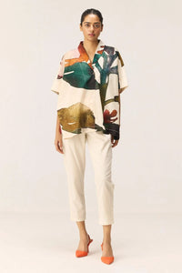 Featuring an off-white anti-fit floral print mul tunic comes with shawl collar, side slits and hand running stitches at the hemline of the tunic and the sleeves.