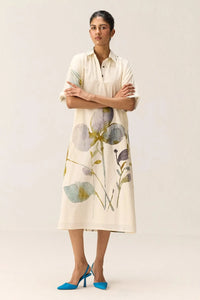 Featuring an elegant off-white hue, this dress is crafted in soft cotton mul with a structured collar and a three-button placket on the front. Hand-painted floral motifs lend subtle charm to the bodice, adding a touch of artistry to the everyday silhouette. Fully lined and finished with pockets for effortless functionality.