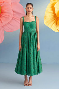 In a regal jade green hue, the Florence Green Dress exudes effortless sophistication. Crafted entirely from delicate imported lace, this flare silhouette dress offers a graceful flow and feminine charm. With its timeless elegance and understated beauty, it makes a refined statement for garden soirées, or evening affairs.