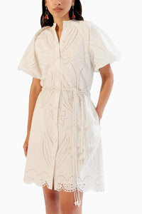 Introducing the Florence Mini that comes in two enchanting variations: Postcard, a placement print on airy viscose linen, and Schiffli Embroidery on premium Giza poplin. Both styles feature a pleated stand-up collar, playful puffed sleeves, and a beautifully crafted crochet belt that cinches the waist for a flattering silhouette.