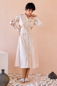 Crafted in a shirt dress silhouette, it features cut-outs at both sides of the waist, revealing a graceful peek of the back. A string tie detail and elasticated back offer adjustability and comfort. The full sleeves are finished with wavy cut-outs supported by sheer organza, adding dimension and lightness. Intricate floral threadwork, bead embroidery, and clean cut-outs adorn the front, collar, and cuffs, highlighted by a peach-toned lining that gently glows through the embroidery.