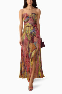 Featuring the Floroscent Daisy Claritta Dress by Saaksha & Kinni's Akara Collection A/W'25. Strapless sweetheart neckline gown with abstract floral print, intricate hand micro pleats, mirror, threadwork, and embroidered panels for a refined and artistic evening look.