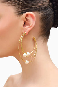 The Flow Hoops Pearl Earrings offer a graceful and modern design, featuring white pearls set on hypoallergenic brass and plated with luxurious 22k gold. The sterling silver posts ensure comfort and durability. These earrings add a refined touch of elegance, perfect for enhancing any outfit with timeless sophistication.