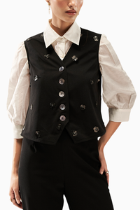 Features Flower Petal Waist Coat Set by Boho Chic from Love Cabo Collection. Hand embellished flower petals on the waistcoat and pants. A classic for your summer wardrobe.