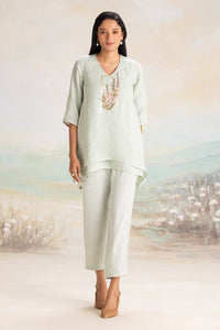 A fit-and-flare, two-layer V-neck top, beautifully edged with unique finishes and a touch of gold for the perfect balance of elegance. Delicate pastel floral embroidery in cotton threads, inspired by the angel's trumpet flower, blooms gracefully out of a timeless golden frame, adding a refined, artistic touch to this sophisticated piece.