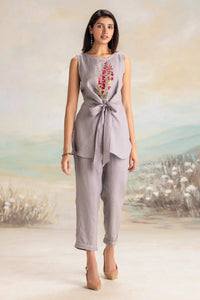 Made from 100% linen, this sleeveless boat neck top features delicate gold-edged finishes and a waist tie for a flattering silhouette. Embellished with striking red floral embroidery inspired by the angel’s trumpet flower, it blends timeless elegance with contemporary charm in a comfortable, easy-to-wear fit.