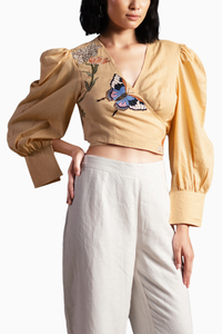 Introducing our wrap-around blouse with vibrant embroidery that adds a splash of color and sophistication. This enchanting garment features a chic overlap effect at the front, puffed sleeves, and broad cuffs with a slit to enhance its distinctive look. Elevate your style quotient with the versatile option to tie a knot at the back or side, allowing you to tailor the blouse to your preferred silhouette. It’s a perfect blend of elegance and versatility, making it a standout piece for any wardrobe.