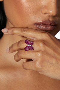 In this masterfully crafted statement statement ring, the wings of the butterfly are adorned with spinel stones that shimmer like dewdrops caught in the morning light, thus adding a touch of sparkle and elegance to this stunning piece which celebrates Nature in all her glory!