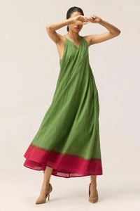 Featuring a unique dip-dyed effect fading from fresh green to soft pink, this flowy strappy gown is crafted in soft cotton mul. The elegant cross-back design complements its graceful silhouette, while side seam pockets add practical functionality. Fully lined for a polished finish.