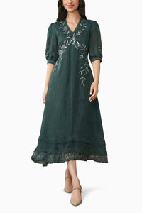 This fit-and-flare V-neck dress features puffed sleeves with delicate lace cuffs and layers of scalloped lace along the hem, creating a graceful, flowing silhouette that moves with every step. Intricate hand-embroidered cotton vines, accented with subtle golden threads, add a touch of warmth, while vibrant crystal dahlia flowers, heat-pressed with care, bloom across the fabric, enhancing its elegance and charm.