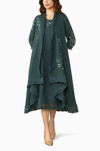 This free-flowing jacket, paired with a fitted dress featuring 3/4th sleeves, is adorned with layers of lace for a relaxed fit that drapes beautifully. The design exudes effortless elegance, enhanced by delicate hand-embroidered cotton vines with subtle golden accents. Blooming into vibrant crystal dahlia flowers, transferred with heat-pressed craft, this ensemble adds a touch of warmth and sophistication, perfect for a polished and graceful look.