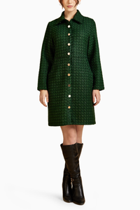 Dark green tweed dress, With front button opening, Soft collar with fringe detailing, Pockets on both sides. Can be styled as a long coat by adding layers underneath