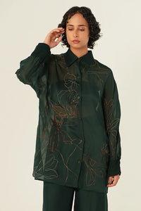 Featuring a sheer forest green shirt in viscose organza, this piece showcases abstract line embroidery in ombré red PVC cord. Designed with full sleeves and gathered cuffs, it offers a relaxed silhouette finished with a classic front button closure.