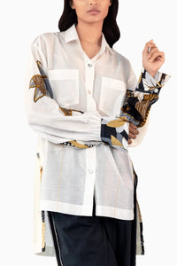 Expertly crafted from soft muslin silk fabric, this White Patchwork Shirt boasts a simple design with a patchwork detail on the sleeve. The front shell buttons and full sleeves add a touch of sophistication, while the box fit and high front with low back design ensure a flattering silhouette.
