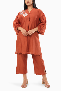 Fabric- Chanderi Silk Color- Rust Details- Thread, Applique Work and Pintuck Detailing Fit- Regular Fit Components- 2 Product Code- SVEORIGWF-24-6CO