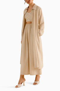 Step into sophistication with our three-piece coord set! This ensemble features an intricately embroidered bustier, a chic trench linen jacket, and stylish wide pants. Perfect for those seeking elegance with a contemporary twist.