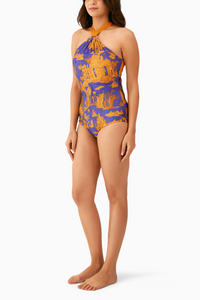 Featuring the alluring Fotia Medal Halter Swimsuit by Tizzi, this elegant piece is designed with a halter neckline and captivating cross-back detailing. The gold-trim at the neck and diagonal seam panel adds a touch of sophistication. Offering modest coverage and equipped with removable pads, this swimsuit combines style and comfort for a timeless beach-ready look.