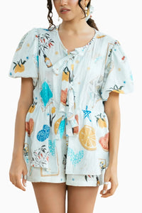 Pair the Found Her Sugar Tier Up Top with the Found Her Sugar Shorts for a breezy, coordinated look thats perfect for sunny days. The top features a charming front tie-up detail, puffed sleeves, and a playful print, while the matching printed shorts offer a comfortable straight fit, elasticated waist, and subtle shell detailing for that effortlessly chic, beachy feel.