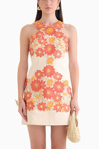 Featuring the Francesca Short Dress from House Of Exotique is a captivating piece. It features a halter neck, floral lace appliqué, and a fitted silhouette. With a round neck and back zipper fastening, it's crafted from twill and lace in a vibrant orange hue.