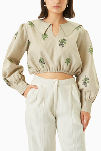 Collared crop top with embroidered leaves, in an evergreen beige colour that can be paired with a large variety of ensembles.