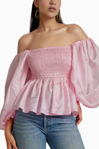 Featuring Frankie Blossom Pink Top by Malie. This top has an elasticated design across the chest and back, with gathers at the cutline that create a frill at the bottom. It drapes loosely over the stomach and showcases elasticated detailing at the sleeve cuffs for a balloon-sleeve effect. Crafted from satin polyester, it is mid-hip length.
